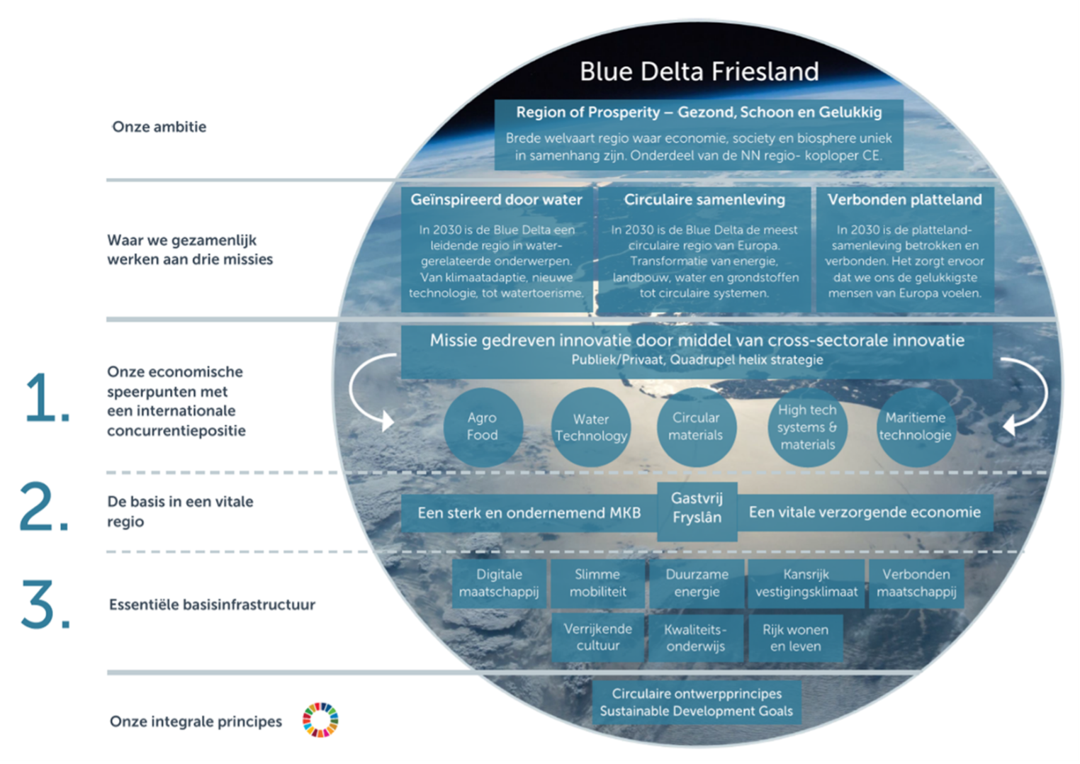 Onze Blue Delta is een landschap waar ruimte is: om te wonen, om schone lucht in te ademen, om te bewegen, te sporten en te ontmoeten. Maar ook ruimte om de toekomst open met elkaar te bespreken en om haar dynamische culturele activiteiten te beleven. Én een landschap dat door onze eeuwige strijd met het water het Friese economische DNA bepaalt: snelle verbindingen, een actiegerichte houding, ruimte voor experiment, oprechte samenwerking en een cultuur van betrokkenheid, betrouwbaarheid en loyaliteit. Met zorg voor de ander én voor volgende generaties. Het Friese ecosysteem is met de vijf speerpunten (Watertechnologie, HTSM, Agrofood, Maritieme Technologie en Circulaire Materials), haar stakeholders en een gezamenlijk gedragen visie de economische toekomstbestendige bouwsteen hiervoor.